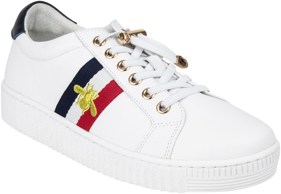 This product is a pair of stylish white sneakers designed with a modern, sporty aesthetic. The shoes feature a clean white leather upper and navy heel cap with contrasting navy and red stripes across the side. The prominent bee emblem in yellow embroidery adds a bold touch, making these sneakers stand out. A navy leather panel is seen at the back heel, while gold eyelets elevate the shoe’s luxe appeal. The sole is thick with a ridged texture for added grip, providing both comfort and durability. Perfect for casual wear, these sneakers combine fashion and function.
