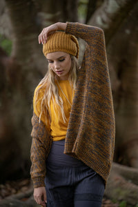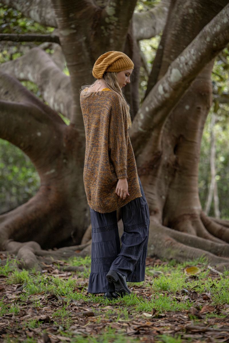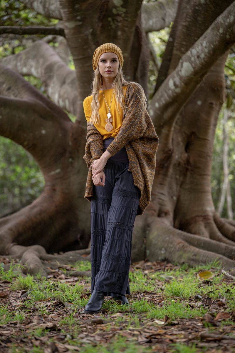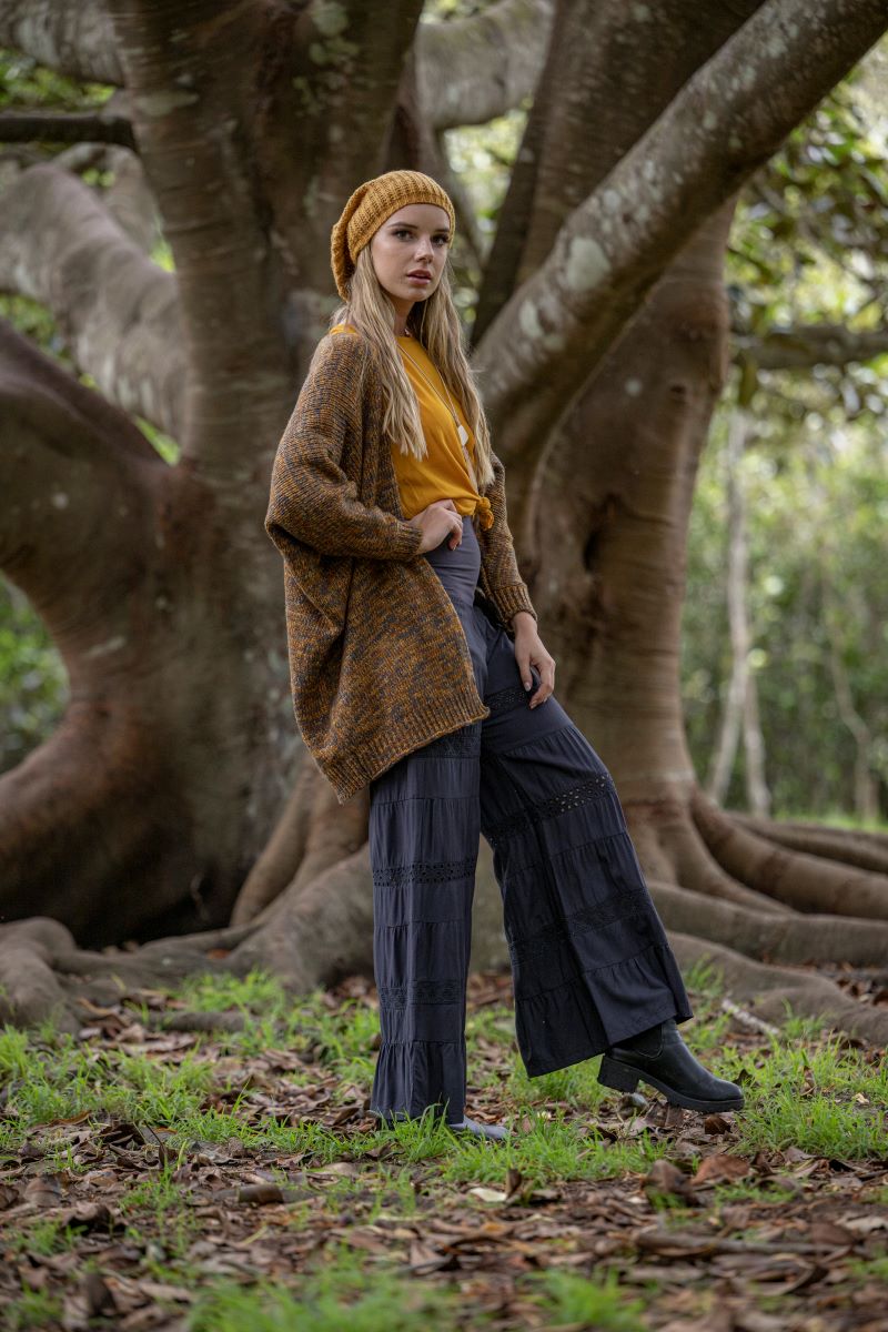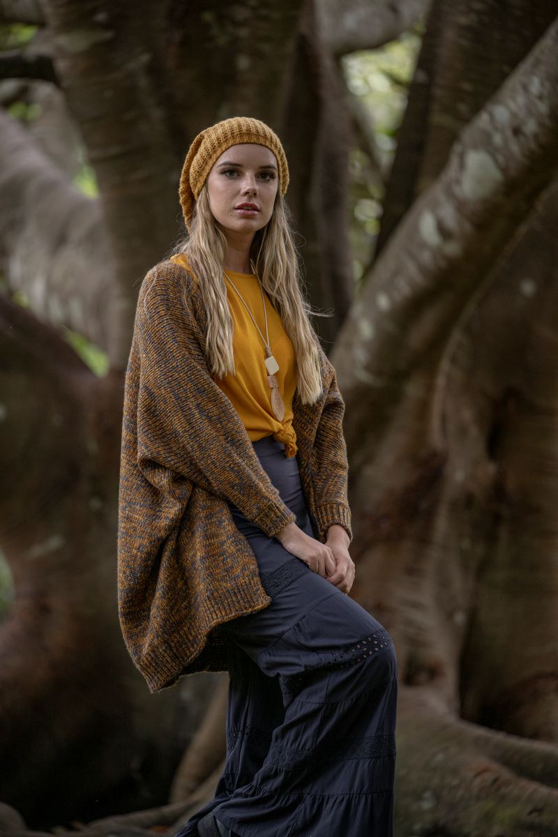The beautiful Bodi Cardi has arrived. This is a gorgeous oversized handmade mohair blend Cardigan. Colours are a mixture of mustard and bronze. Soft, Snuggly, and no itchiness. Worn here with the Lil Top in Mustard, Rib Beanie in Mustard and the Tropez Pants in Charcoal.