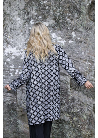Roxy Coat Black with white embroidery. Long Coat in a lightweight fabric.