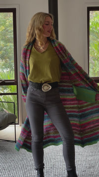 The Vail Coatigan is a lovely handmade Coatigan made with a mohair blend wool. The colours are a vibrant mix of cerise, chartreuse and sky blue all woven in an intricate striped pattern. This Coat has side pockets.