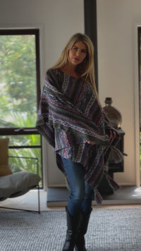 The Lugano Poncho is a lovely handmade knit made with a mohair blend wool. The colours are a stunning blend of blues, mauves and green woven in an intricate striped pattern.