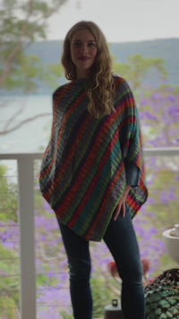 The Vail Poncho is a lovely handmade mohair wool blend. The colours are a vibrant mix of cerise, chartreuse and sky blue all woven in an intricate striped pattern.