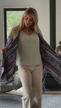 The Lugano Wrap is a lovely handmade knit made with a mohair blend wool. The colours are a stunning blend of blues, mauves and green woven in an intricate striped pattern.