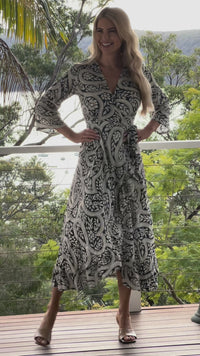 Leura L/Sleeve Wrap Dress, navy and white print with gold leaf.