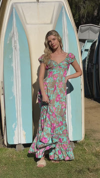 Stunning Silky Fabric with the most amazing Aqua background and Hot Pink Flowers. This dress can be worn on or off the shoulders.