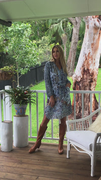 Louis Long Dress made in a Viscose Twill. Gorgeous Light Blue with a lovely gold tone pattern through. Button Front, Collar and Side Pockets.