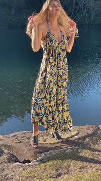 Carina Bikini Tie Halter Dress gorgeous tropical print in pale orange and aqua.