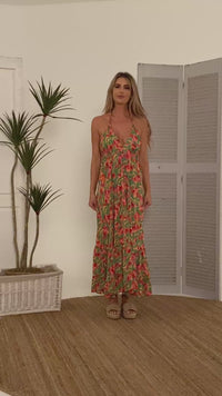 Lucia Bikini Tie Halter Dress a gorgeous tropical print in reds, oranges and limes.