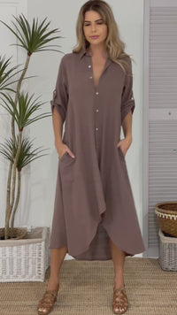 A lovely Cotton Dress with adjustable Sleeves. Button Down Front. Side Pockets.