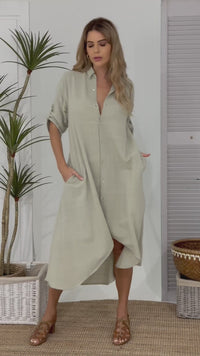 A lovely Cotton Dress with adjustable Sleeves. Button Down Front. Side Pockets.