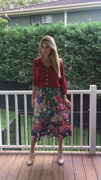 Honeybird Frill Skirt is a lovely Mid Length Skirt made from Viscose Twill. The stunning digital print is a base colour of emerald with tones of pinks and aquas The waist is a thick elastic. This fabric is thicker so its great for the cooler Seasons. Wear with an ankle boot and a knit.