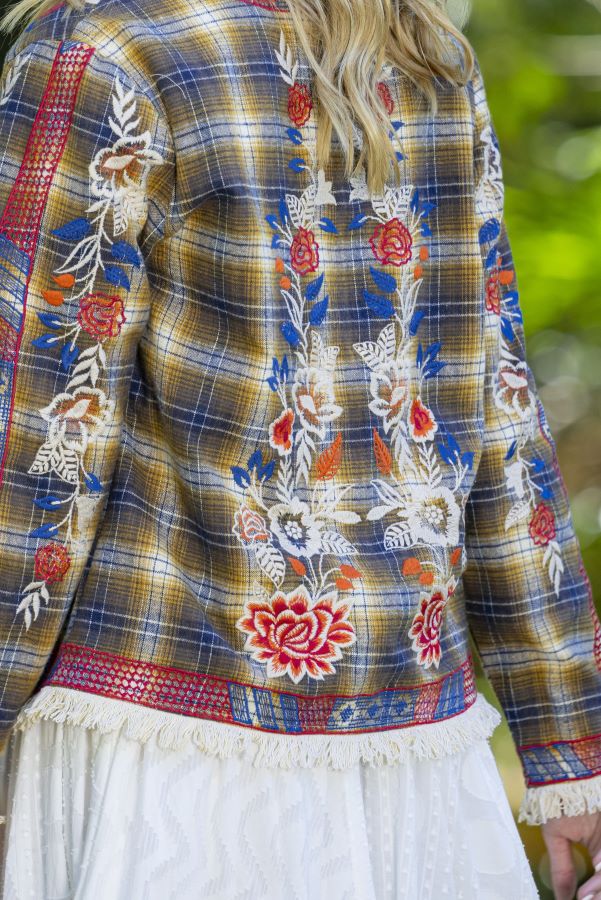 Jacket has lovely embroidered of flowers in tones of orange, cream, reds and blues.