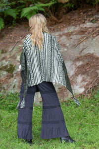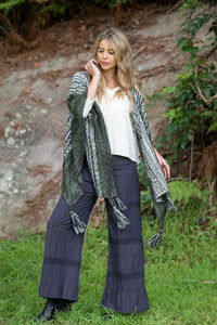 A lovely warm soft knitted wrap! Hand made in tones of Khaki and Off White. Gorgeous hand made tassles on the ends. Made from Mohair Acrylic Blend Wool. Free Size.