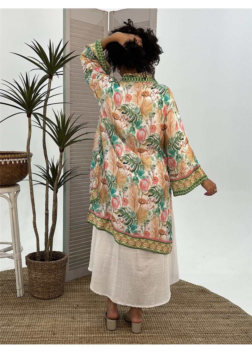 Effortlessly chic and beautifully lightweight, this silk viscose kimono adds a touch of bohemian luxury to any outfit.  The flowing silhouette drapes gracefully over the body, creating a flattering and relaxed fit.