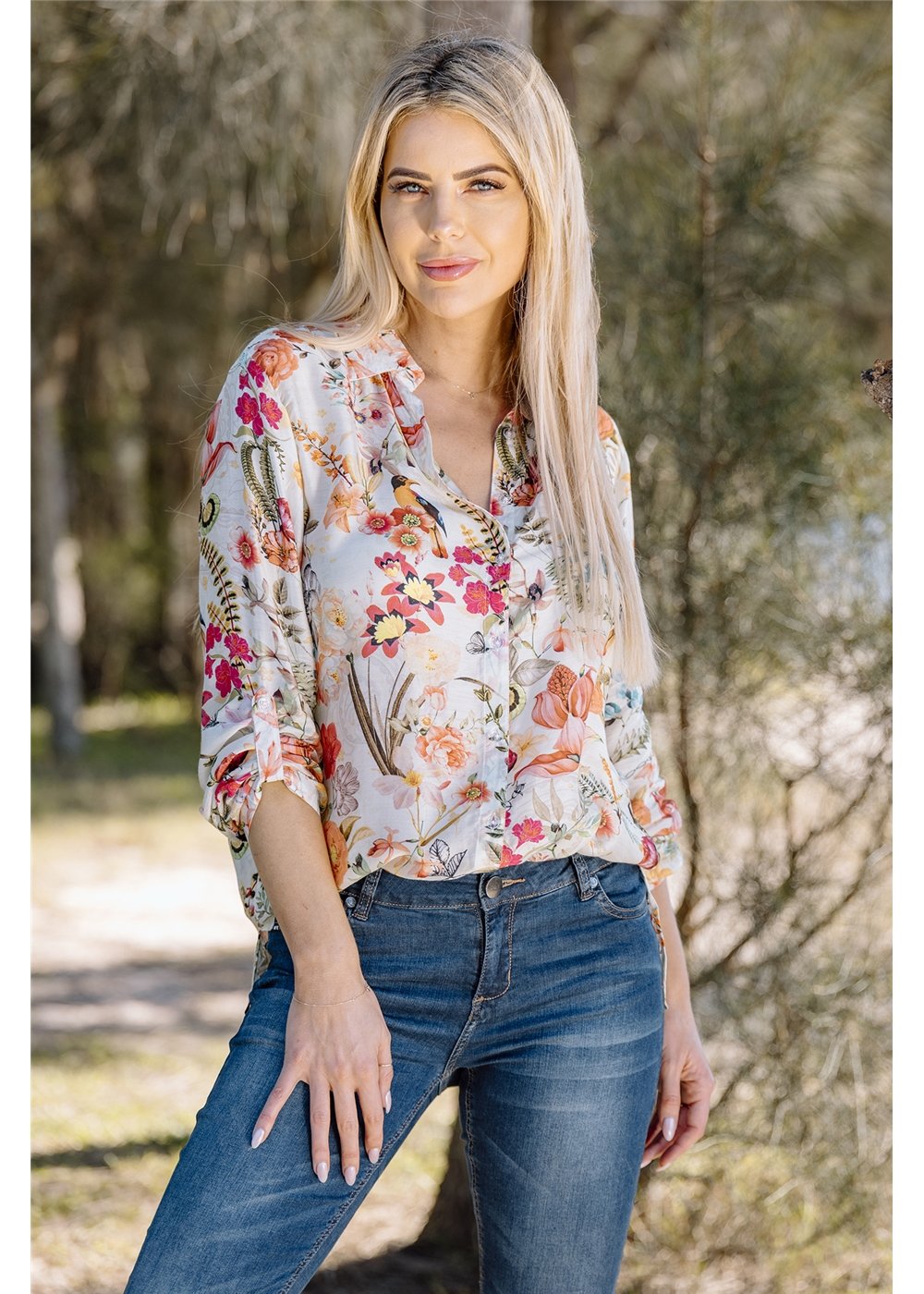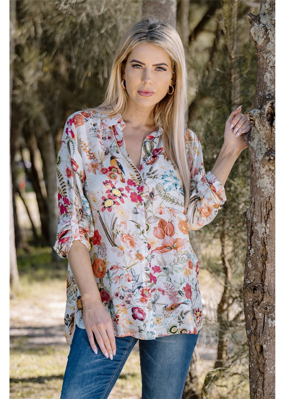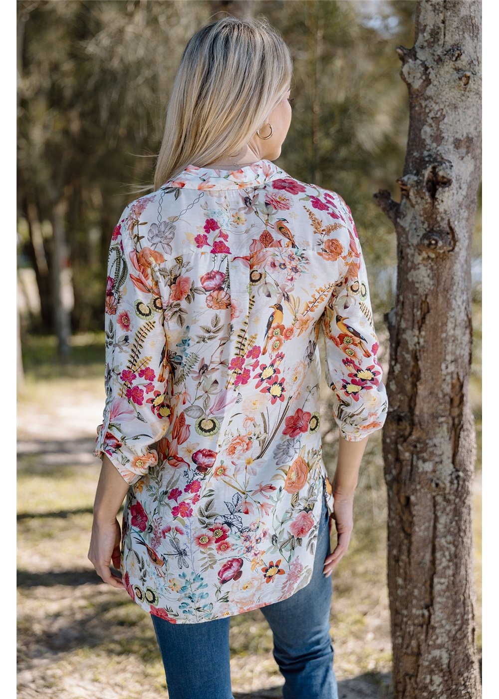 A timeless classic with a modern feminine twist.  This silk viscose shirt features a beautifully detailed floral print that captures the essence of relaxed elegance.  Crafted from aluxurious silk-viscose blend, it drapes softly on the boty and feels light and breathable - perfect for warm days or layered looks.