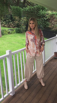 Aziza Shirt has a collar with buttons all the way down the front. You can roll the sleeves up and button up with tab on sleeves.