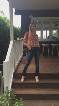 Aziza Top one of our best selling style in viscose twill. The Aziza Top has pull up long sleeves, shell bottoms down the front. A lovely print with splashes of Burnt Orange and Red. Elastic on the bottom of the top for a good fit.