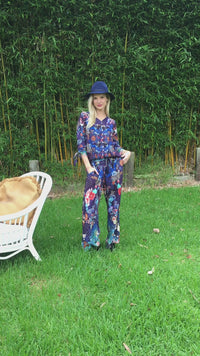 One of our best selling style in our twill fabric. The Moonflower Top has pull up long sleeves, shell bottoms down the front. A lovely Blue Print with White Cranes and Flowers. Elastic on the bottom of the top for a good fit.
