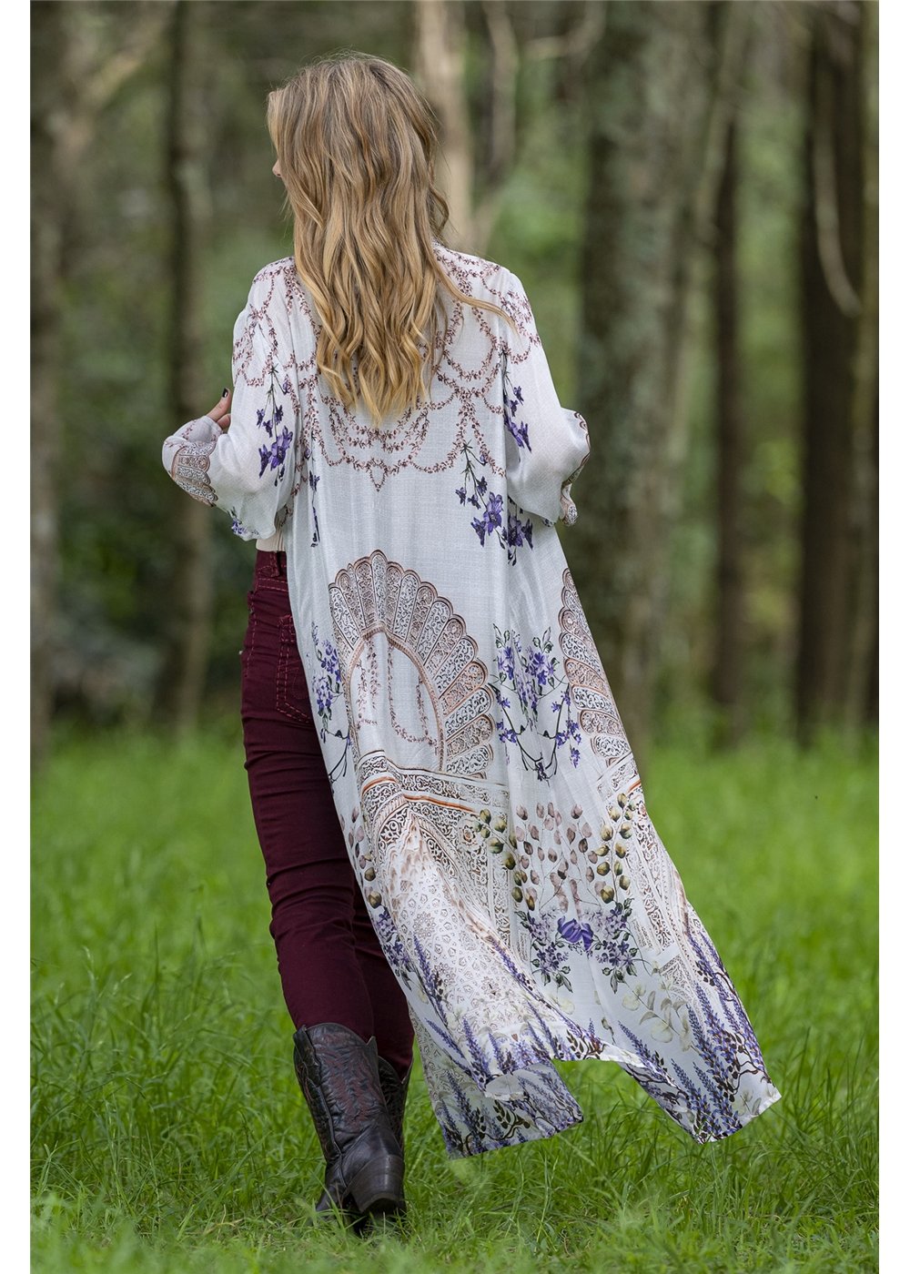 Lovely Silk/Viscose Duster by Cienna Designs in stunning floral Lavender print. This pretty duster has an array of pretty lavender flowers on a soft grey background. This pattern is a so soft and feminine.
