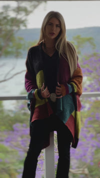 The Coburg Grandpa Cardi is a lovely handmade knit made with a mohair blend wool. This fun, oversized cardi pops with a vibrant blend of colours like rust, chartreuse and sky blue - all woven together in an interesting block pattern.