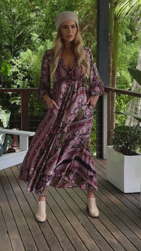 Evi Maggie Dress in a gorgeous pink and blush silk blend fabric. Lovely cross over front, mid length sleeves with frill under the bust and on the bust line.