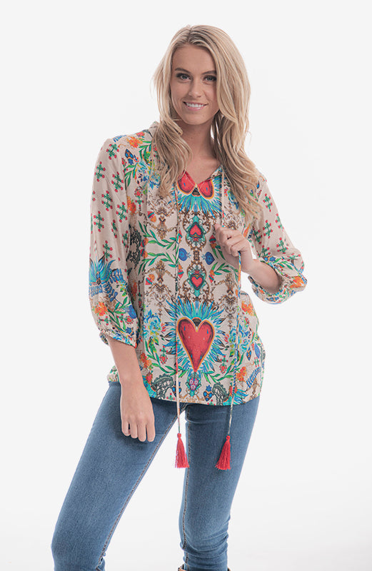 Our gorgeous Mexicana Blouse has finally arriveed! We love this Mexican print with the Mexican hearts. Lovely Ties with tassels decorate the front. Easy to wear Blouse.