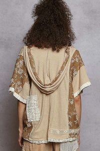 This patchwork top is a true statement in laid-back luxury. Crafted from a soft, breathable fabric, it features a beautifully oversized silhouette with intricate lace panels, raw-edged seams, and delicate applique floral details that give it a handcrafted, one-of-a-kind fell.