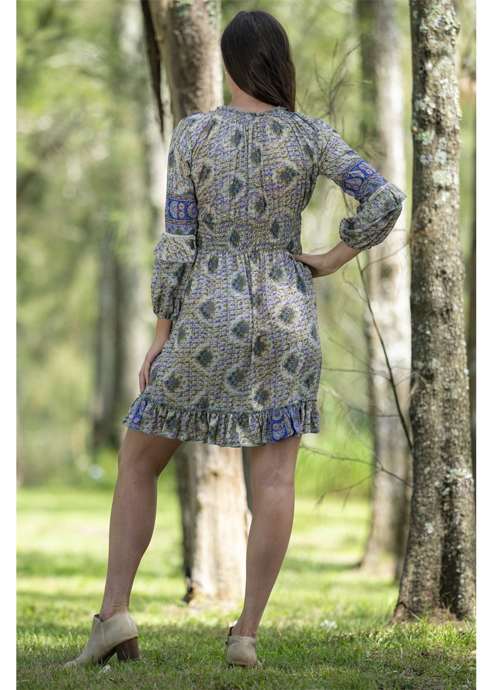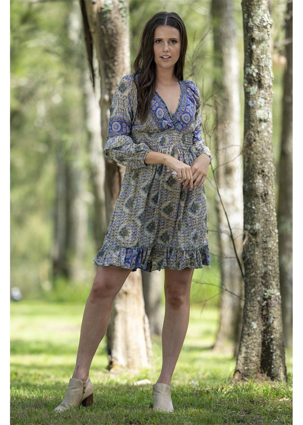 Lovely Bohemian style dress with 3/4 sleeves. Knee Length. Sweetheart Neckline and a frill on the hemline.