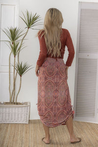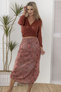 Gina is wearing the Knit tie top in Rust with this skirt.
