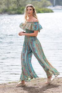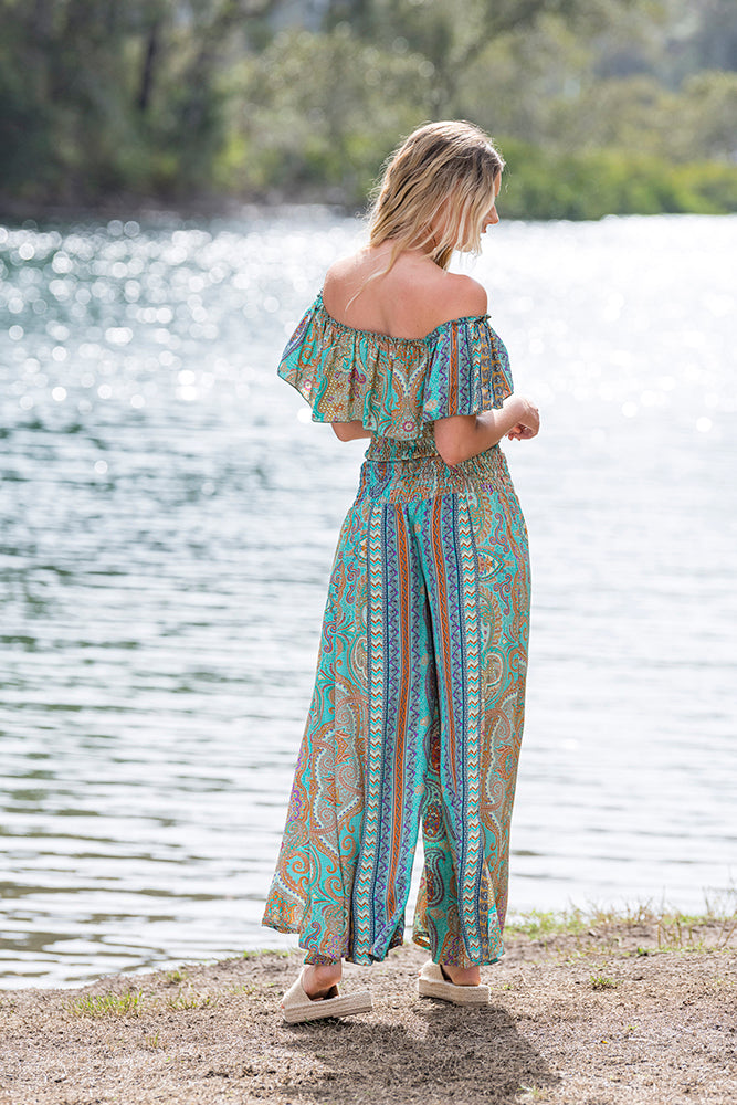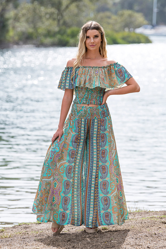 Super soft silk blend fabric is what these stunning pants and top are made of. Sold as a set. Flare pants with a great elastic shirring to keep your tummy flat, with a gorgeous matching top which can be worn on or off the shoulders.