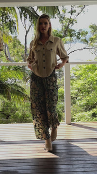 Wide Leg Pants in a lovely vintage floral print tones of Ivory and Black with gold shimmer. Worn with our Mocha Shirt.