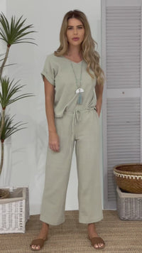 Cool Cotton, in a lovely faint light green sage colour. Elastic Waist with decorative shell buttons down the front. Drawstring in the front.