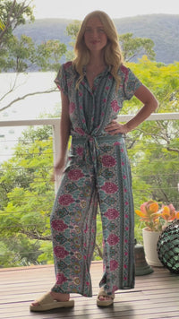 This stunning floral and stripe pattern in greens with a pop of pink is a lovely, versatile top with a tie front.