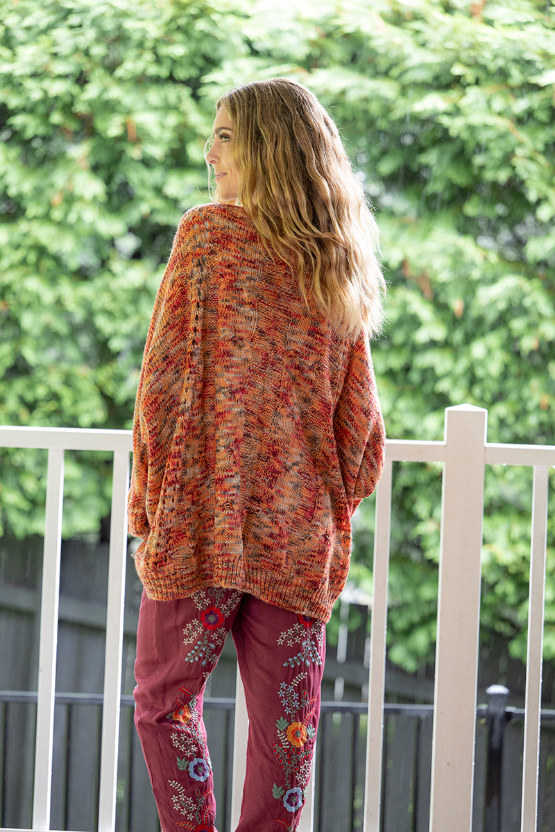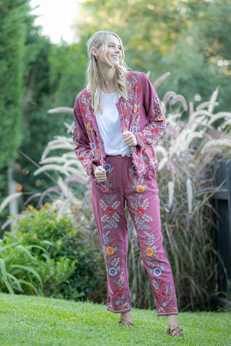 The most beautiful cotton pants with embroidery by Cienna Designs. The Harta Pants just scream Spring. Stunning embroidery over the front of these wine full length pants in red, blue, green and orange colours. These pants can match up with any colour as a top – you choose your look. Flattering waistline too. Side pockets and elastic waist.