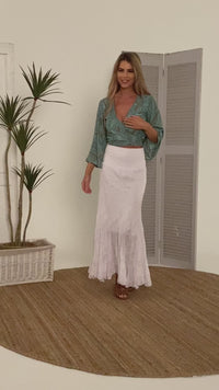Stunning silk blend top that can be wrapped around or tied up in the middle. Worn here with the Nova Skirt or wear with matching pants or skirt.