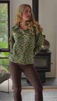 This flattering collared sweater is in shades of green that can be matched with many different colours.