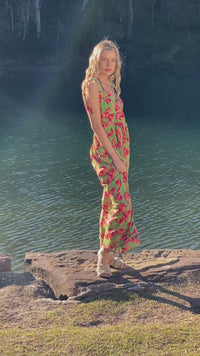 Lucia Tie Shoulder Maxi Dress - Stunning Tropical print in tones or reds, oranges and limes.