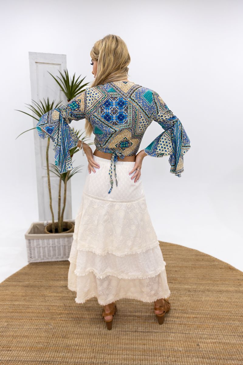 Perfect for warm weather days, this versatile skirt pairs effortlessly with printed tops, camis or cropped bouses for a timeless, easygoing look. Whether worn barefoot on the beach or dressed up with boots and accessories, it's a piece that captures effortless grace and everyday charm.