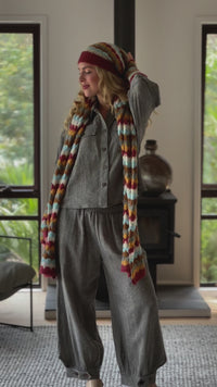 The Aspen scarf is a funky handmade knit made with a mohair blend wool. The colours and pattern are a wonderful throwback to the 70's vibe, a great addition to any outfit.